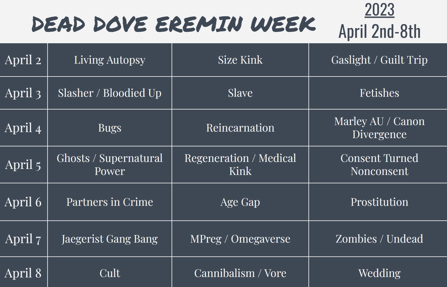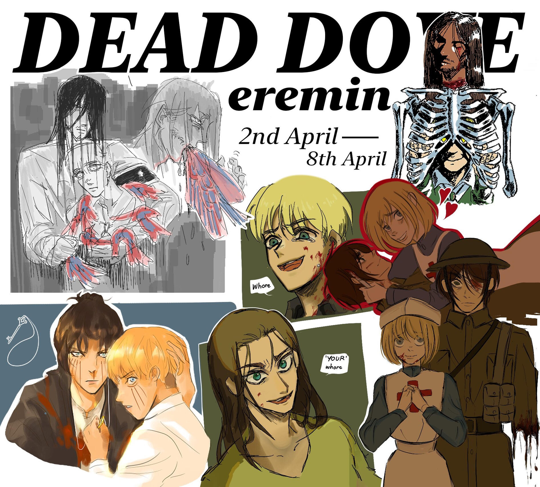 Dead Dove is a fandom trope/tag that references a sitcom scene where the character sees a bag labeled “DEAD DOVE: DO NOT EAT” and opens it to find that it contains exactly what it says. Similar to the tag Don’t Like, Don’t Read, dead dove in fiction may include content considered problematic and immoral. If you’re not comfortable with fictional depictions of death, noncon, underage, etc, please feel free to block or mute @DDEreminWeek and #deaddoveEremin